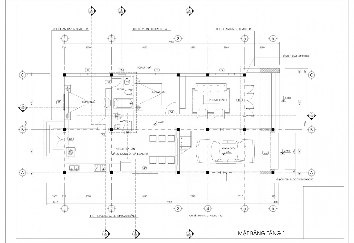 Tầng 1 : Gara + Phòng khách + Phòng bếp ăn + Phòng giặt + Wc + Phòng ngủ