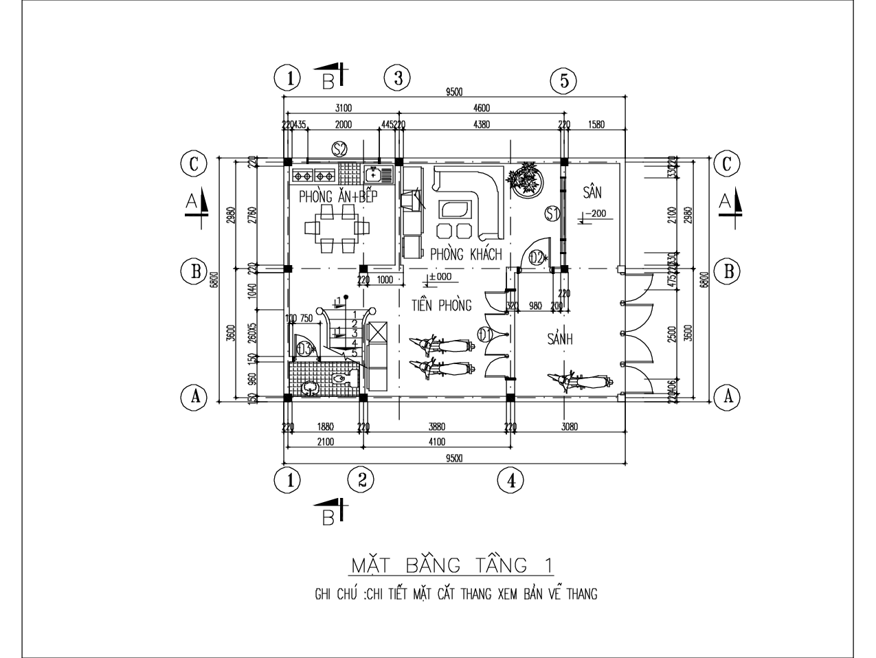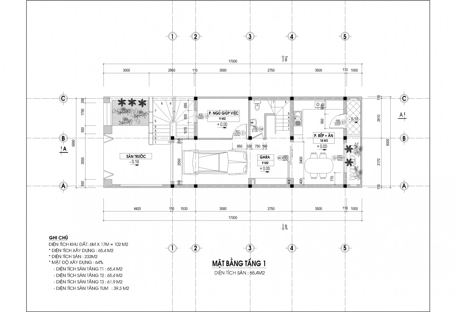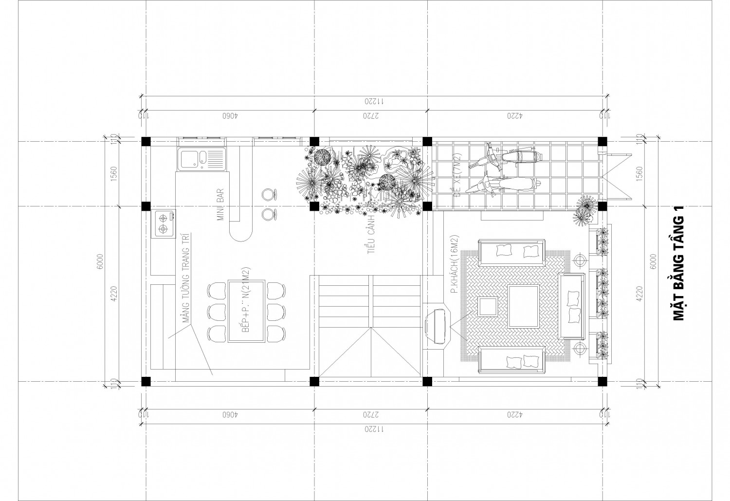 Tầng 1 : Nhà đẻ xe + Phòng bếp ăn + Wc