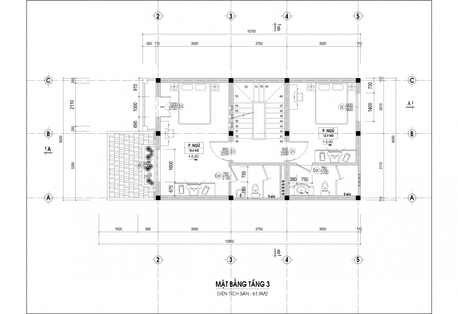 Tầng 3 : 2 Phòng ngủ + 2 Wc
